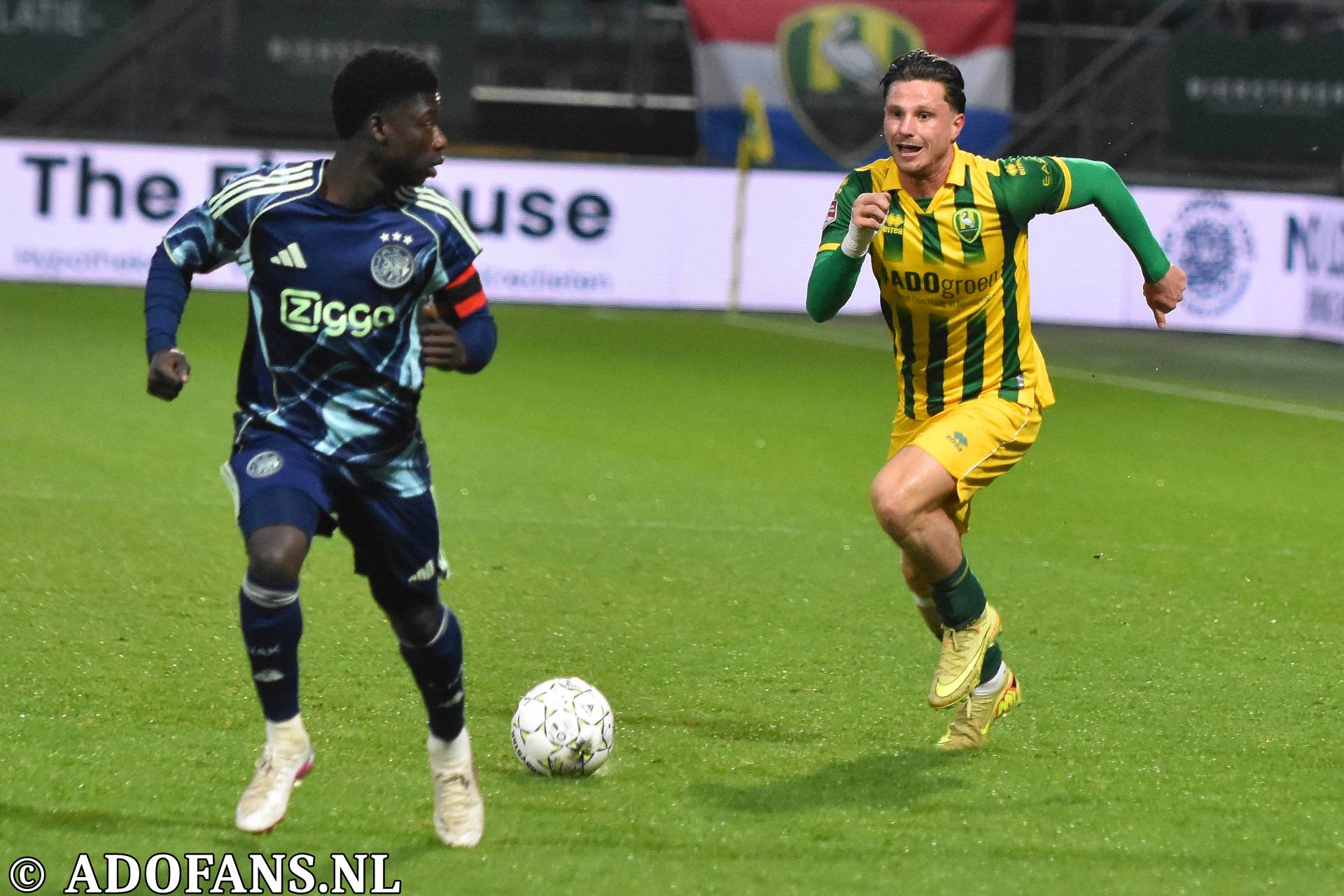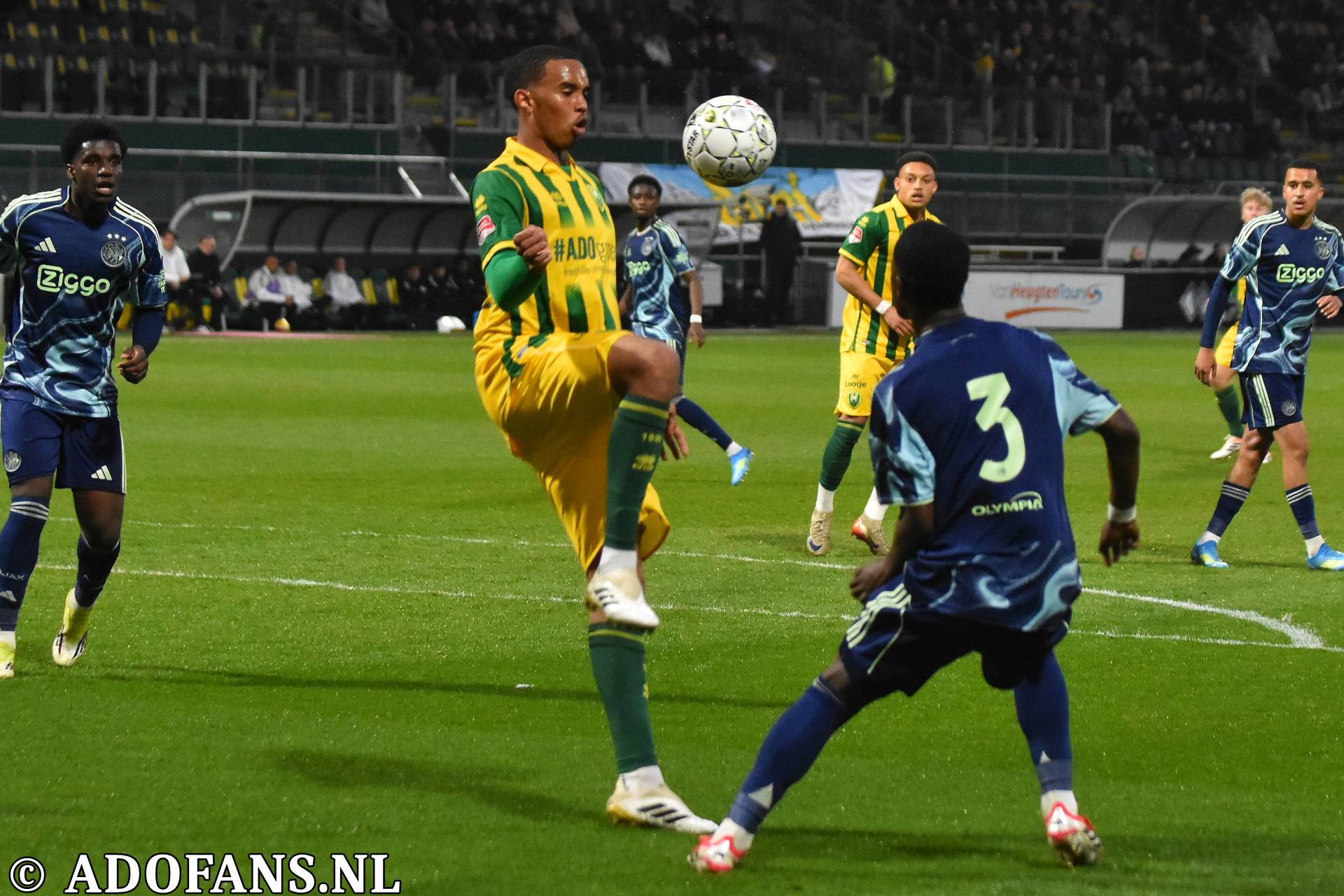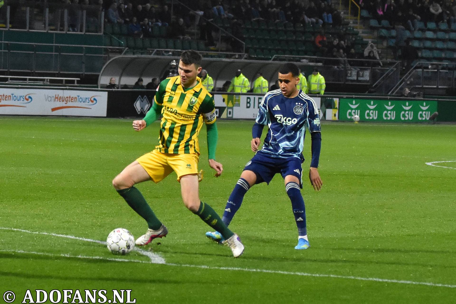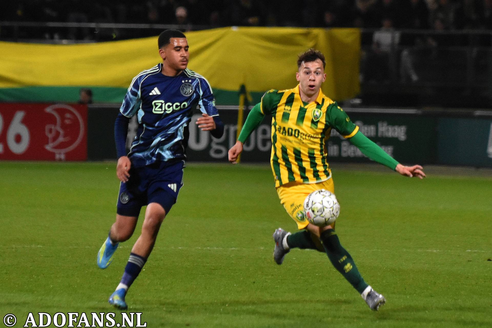 Er waren wat kansjes over en weer in de eerste tien minuten, maar de Haagse formatie had overwicht. In de elfde minuut werd de bal door Evan Rottier op de paal van het doel van keeper Reverson gewerkt, maar de arbitrage had al buitenspel aangegeven. Vier minuten later was het aan de andere kant van het veld wel raak. Skye Vink verraste keeper Kilian Nikiema: 0-1. Twee minuten later was er een grote mogelijkheid voor de Amsterdammers om de voorsprong te vergroten, het resultaat was gelukkig slechts een corner die niets opleverde. Een afstandsschot in de 20e minuut van Lucas Jetten werd gestopt door Nikiema. Van Mieghem was even later dicht bij een treffer, maar de Amsterdamse keeper wist met een katachtige redding de bal uit het doel te houden. Een kwartier voor rust kwam de 0-2 op het scorebord door Don O'Niel. Lang kon de tegenstander daar niet van genieten, want vanuit de verlenging van een ingooi bracht Daryl van Mieghem de stand een minuut of wat later op 1-2. Alweer een enorme redding van keeper Everson voorkwam een paar minuten later dat ADO gelijk maakte. Vijf minuten voor de thee veerde het publiek op toen Jesse Bal loon naar werken kreeg. De jonge aanvaller was al een paar keer voor het doel van Reverson opgedoken, en had daarbij een keer rakelings over het doel geschoten, maar nu was het dan wel raak: 2-2. Het doelpunt kwam overigens op naam van Jong Ajax-speler Jinairo Johnson die de bal als laatste had aangeraakt. In de extra minuten van de eerste helft was Ajax nog even gevaarlijk, maar tot een doelpunt kwam het niet zodat de kleedkamers met de 2-2 gelijkstand konden worden opgezocht.