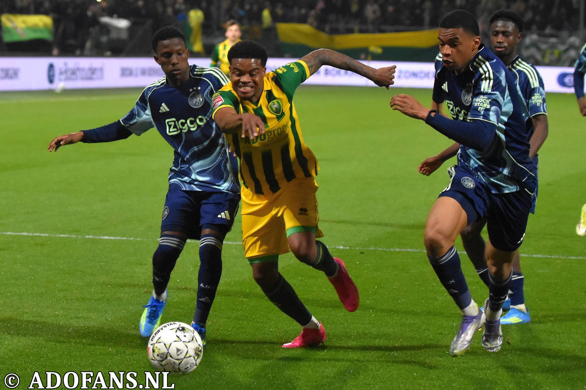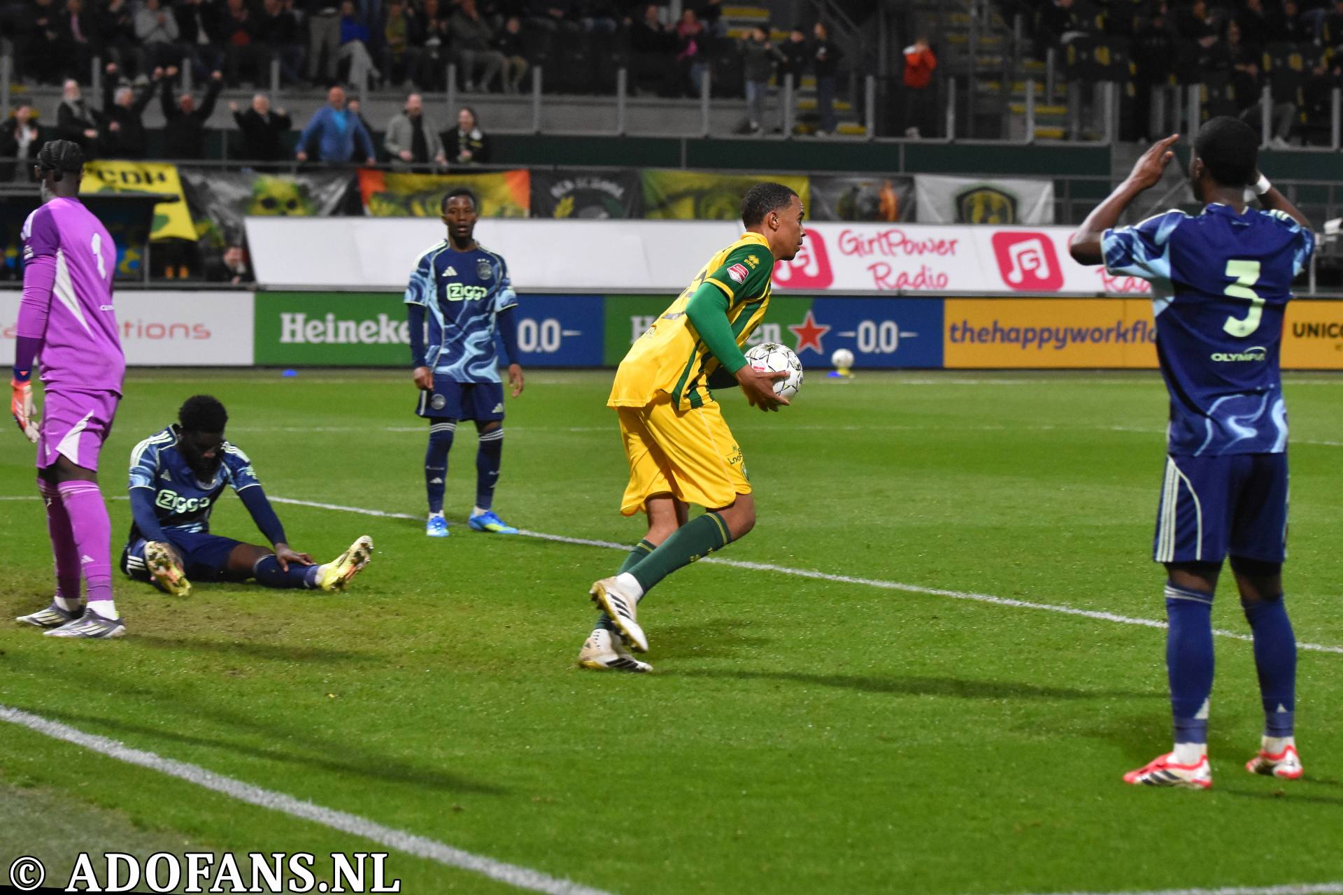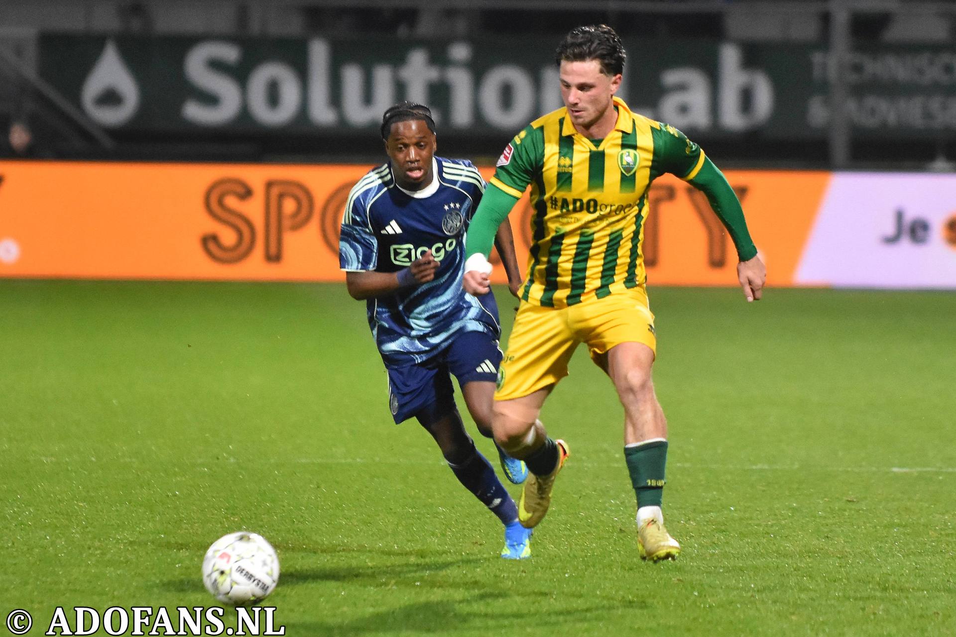 Er waren wat kansjes over en weer in de eerste tien minuten, maar de Haagse formatie had overwicht. In de elfde minuut werd de bal door Evan Rottier op de paal van het doel van keeper Reverson gewerkt, maar de arbitrage had al buitenspel aangegeven. Vier minuten later was het aan de andere kant van het veld wel raak. Skye Vink verraste keeper Kilian Nikiema: 0-1. Twee minuten later was er een grote mogelijkheid voor de Amsterdammers om de voorsprong te vergroten, het resultaat was gelukkig slechts een corner die niets opleverde. Een afstandsschot in de 20e minuut van Lucas Jetten werd gestopt door Nikiema. Van Mieghem was even later dicht bij een treffer, maar de Amsterdamse keeper wist met een katachtige redding de bal uit het doel te houden. Een kwartier voor rust kwam de 0-2 op het scorebord door Don O'Niel. Lang kon de tegenstander daar niet van genieten, want vanuit de verlenging van een ingooi bracht Daryl van Mieghem de stand een minuut of wat later op 1-2. Alweer een enorme redding van keeper Everson voorkwam een paar minuten later dat ADO gelijk maakte. Vijf minuten voor de thee veerde het publiek op toen Jesse Bal loon naar werken kreeg. De jonge aanvaller was al een paar keer voor het doel van Reverson opgedoken, en had daarbij een keer rakelings over het doel geschoten, maar nu was het dan wel raak: 2-2. Het doelpunt kwam overigens op naam van Jong Ajax-speler Jinairo Johnson die de bal als laatste had aangeraakt. In de extra minuten van de eerste helft was Ajax nog even gevaarlijk, maar tot een doelpunt kwam het niet zodat de kleedkamers met de 2-2 gelijkstand konden worden opgezocht.