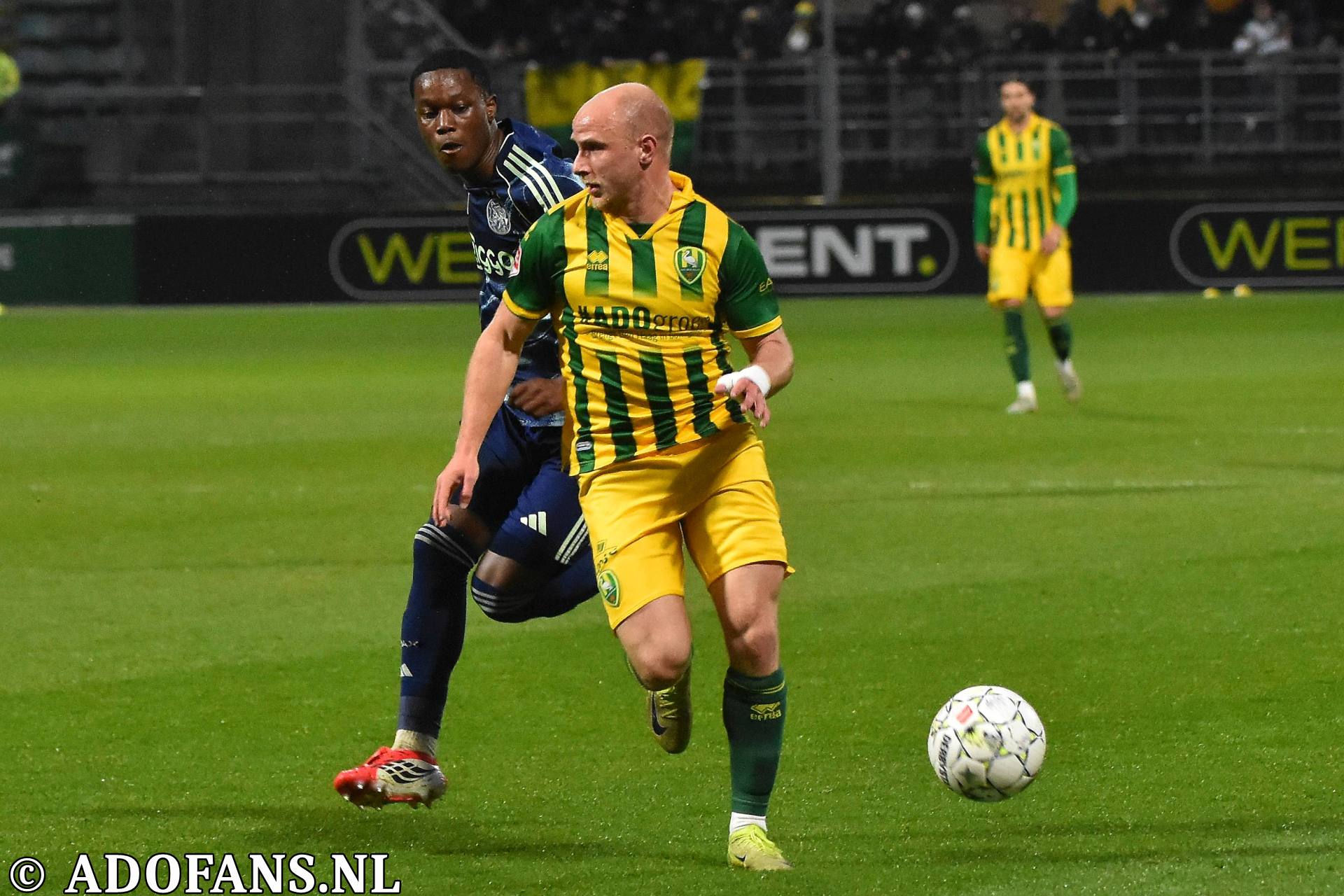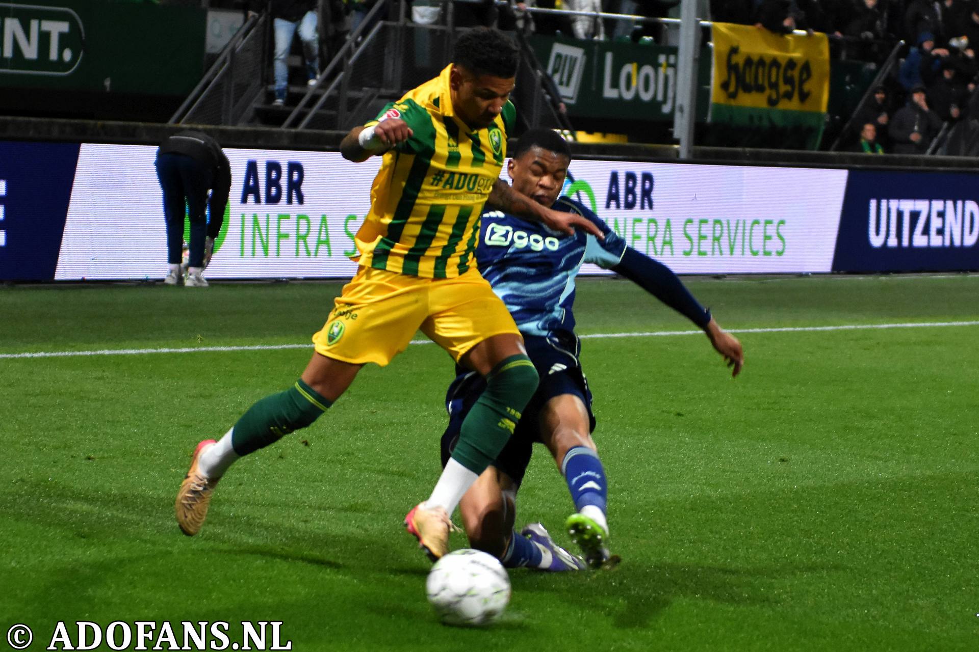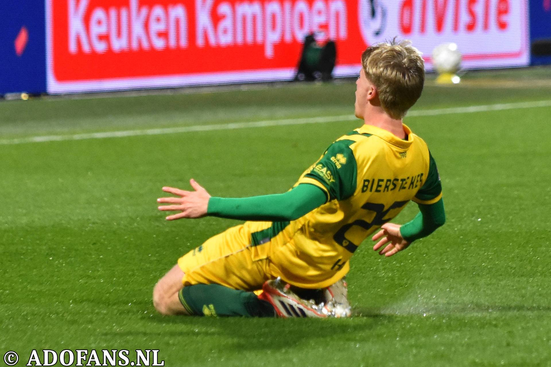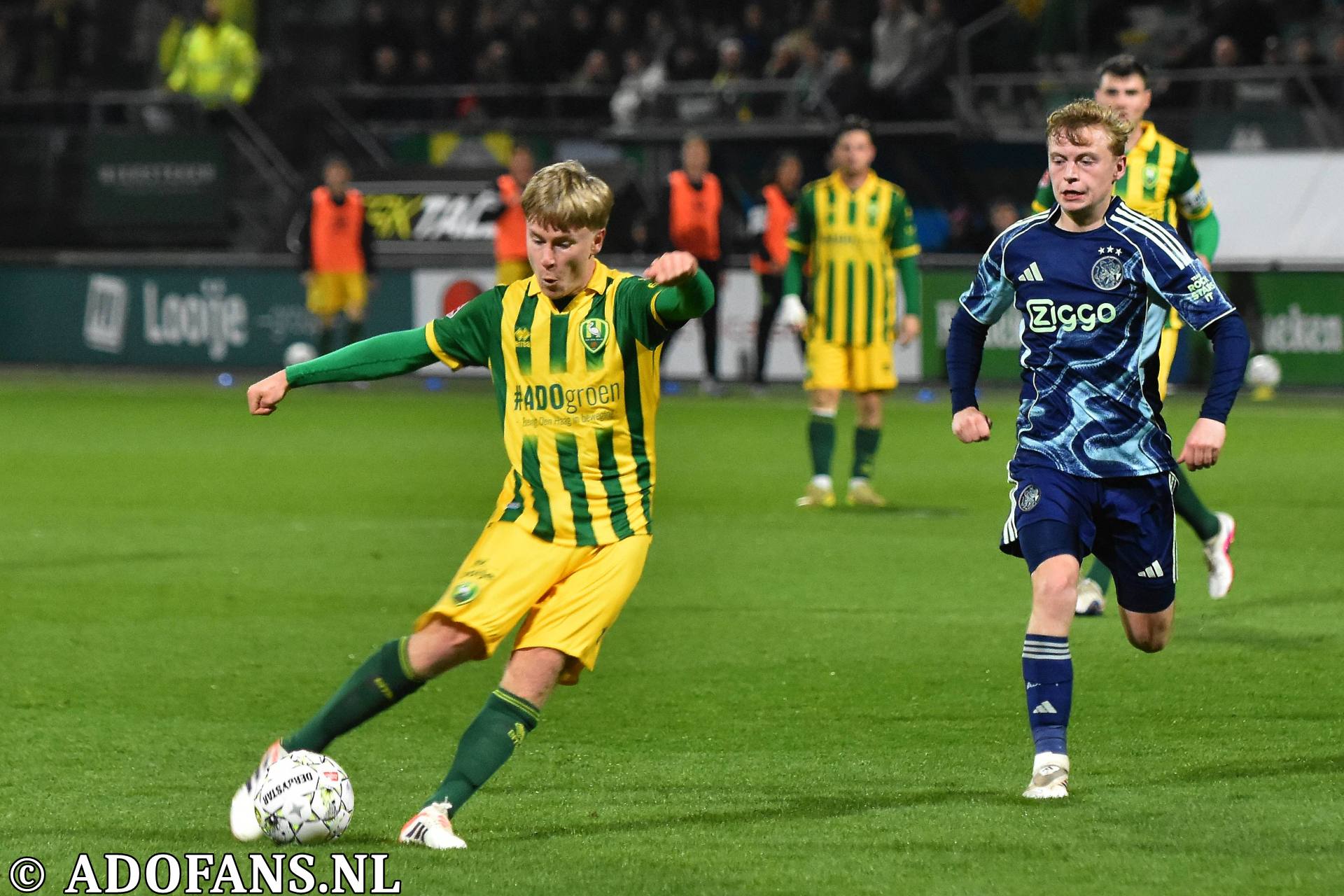 Er waren wat kansjes over en weer in de eerste tien minuten, maar de Haagse formatie had overwicht. In de elfde minuut werd de bal door Evan Rottier op de paal van het doel van keeper Reverson gewerkt, maar de arbitrage had al buitenspel aangegeven. Vier minuten later was het aan de andere kant van het veld wel raak. Skye Vink verraste keeper Kilian Nikiema: 0-1. Twee minuten later was er een grote mogelijkheid voor de Amsterdammers om de voorsprong te vergroten, het resultaat was gelukkig slechts een corner die niets opleverde. Een afstandsschot in de 20e minuut van Lucas Jetten werd gestopt door Nikiema. Van Mieghem was even later dicht bij een treffer, maar de Amsterdamse keeper wist met een katachtige redding de bal uit het doel te houden. Een kwartier voor rust kwam de 0-2 op het scorebord door Don O'Niel. Lang kon de tegenstander daar niet van genieten, want vanuit de verlenging van een ingooi bracht Daryl van Mieghem de stand een minuut of wat later op 1-2. Alweer een enorme redding van keeper Everson voorkwam een paar minuten later dat ADO gelijk maakte. Vijf minuten voor de thee veerde het publiek op toen Jesse Bal loon naar werken kreeg. De jonge aanvaller was al een paar keer voor het doel van Reverson opgedoken, en had daarbij een keer rakelings over het doel geschoten, maar nu was het dan wel raak: 2-2. Het doelpunt kwam overigens op naam van Jong Ajax-speler Jinairo Johnson die de bal als laatste had aangeraakt. In de extra minuten van de eerste helft was Ajax nog even gevaarlijk, maar tot een doelpunt kwam het niet zodat de kleedkamers met de 2-2 gelijkstand konden worden opgezocht.